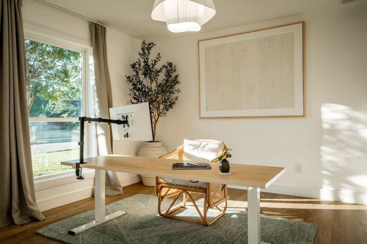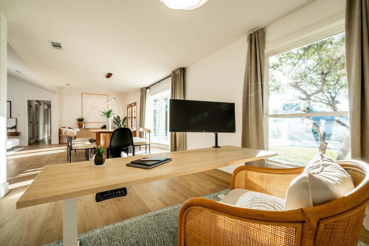 – Office/Desk area with 32″ monitor & electric adjustable desk