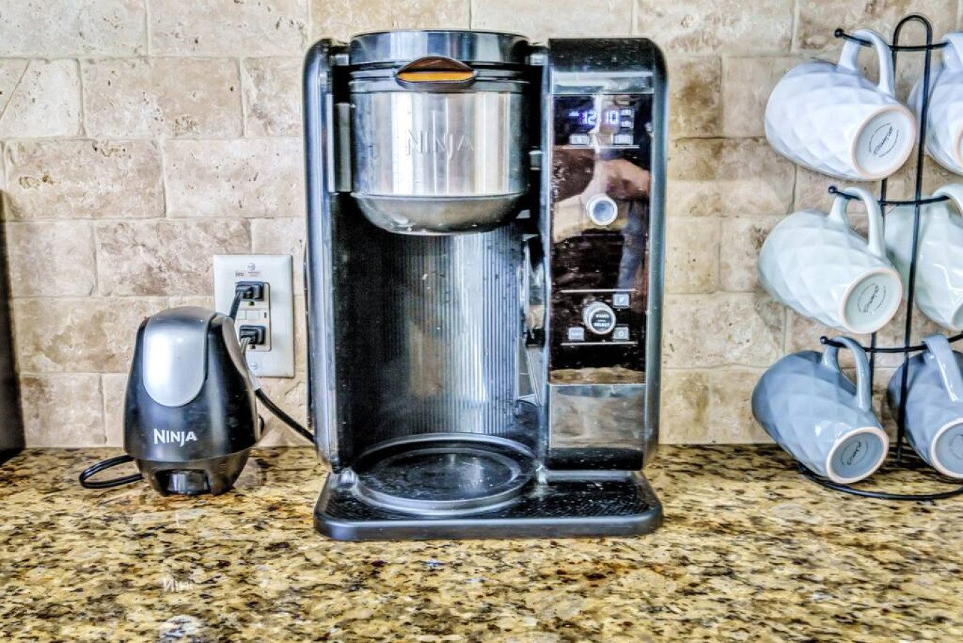 Kitchen: Fully stocked with cookware, coffee machine, and modern appliances.